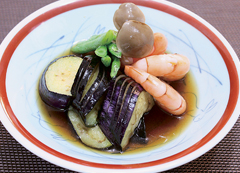 茄子-3本海老-12尾★下味 塩-小1/2 酒-大1 ブナシメジ-1/2パック インゲン豆-6本 出し汁-300cc★調味料 薄口醤油-大1.5 砂糖-小1/2 みりん-大1.5 酒-大1/2