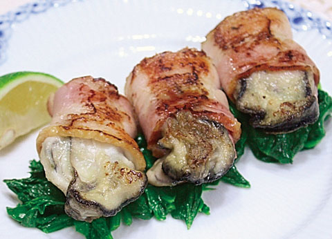 牡蠣(大サイズ)-12個(250g) ★下味 塩・胡椒-少々 小麦粉-適量 ベーコン-6枚 オリーブオイル-小さじ1 ほうれん草-1束 バター-小さじ1 黒胡椒(お好みで)-適量 レモン(くし切り)-1/2個