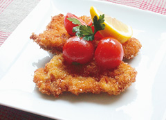豚フィレ肉-200g 塩・胡椒-少々 小麦粉-大2くらい 玉子-1個 パン粉-50g パルメザンチーズ-15g バター-30g ミニトマト(半分に切る)-8個 パセリ(粗みじん)-少々 塩・胡椒-少々 オリーブオイル-大1.5 バルサミコ酢(米酢)-小1 レモン-1/2個