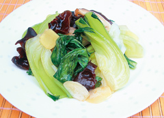 青梗菜-2株 干し椎茸(スライス)-2枚 きくらげ(一口大)-3g にんにく(薄切り)-1かけ 生姜 (薄切り)-1かけ 白葱 (1cm幅の斜め切り)-1/2本 ★調味料 塩-小2/3 胡椒-少々 紹興酒-大 1 水溶き片栗粉-小1~ (片栗粉:水=1:2) 胡麻油-小1
