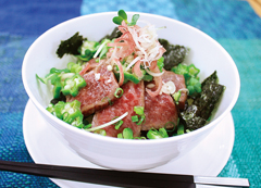 牛肉タタキ-160g ★下味 醤油-大さじ 2 みりん-大さじ 2 わさび-小さじ 1/4 温かい御飯-2杯分(400g) もみのり-適量 黒胡椒-適量 貝割れ大根-適量 オクラ-3本 ミョウガ-2個 青葱-1本