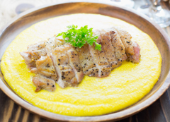 鶏もも肉-1枚 クレイジーソルト-適量 チャービル-適量 オリーブオイル-大さじ1 ★カボチャソース カボチャ-180g 玉ネギ-1/2個 牛乳-180cc 生クリーム-30cc クリームチーズ-80g パルメザンチーズ-大さじ1 塩-小さじ1 オリーブオイル-大さじ1