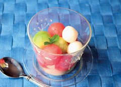 白玉粉-50g 水-40cc グラニュー糖-小2 メロン、すいか-適量(250g) 飾り用-ミントの葉 ★シロップ グラニュー糖-40g 水-150cc はちみつ-大1 桂花陳酒(あれば)-大1
