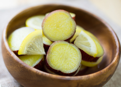 さつま芋は厚さ1cm の輪切りにして流⽔する。レモンは輪切りに する。