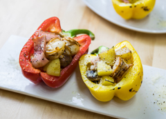 パプリカ⾚⻩-各1個ベーコン-80gボイルホタテ-7〜8匹ジャガイモ-1個マッシュルーム-4個ニンニク-1 ⽚醤油-⼤さじ1塩胡椒-少々パルメザンチーズ-少々オリーブオイル-⼤さじ1