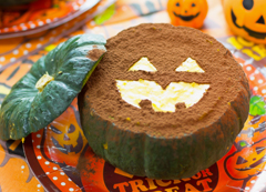 - 坊ちゃんカボチャをラップでくるみ電子レンジで加熱し火を通し、粗熱をとる。カボチャの上2cm を切り落とし、種とワタを取り除く。※加熱したカボチャは高温になっていますので、火傷に注意して下さい。