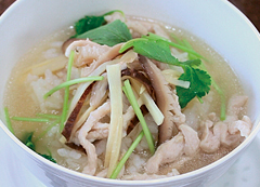 鶏胸肉(細切り)-1枚 ★塩・胡椒・酒-各少々 片栗粉-小さじ1/2 干し椎茸(千切り)-3枚 ゆでたけのこ(千切り) -100g 三つ葉(4cm長)-1束 中華スープ-1,000cc 塩-適量(小1/2位) 胡椒-やや多め 温かい御飯-4人前