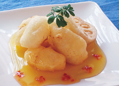 鱈(ひと口大)-3切れ★下味 塩・胡椒・老酒-各少々 蓮根(5mmスライス)-8枚 片栗粉-適量★衣 薄力粉-75g 片栗粉-10g ベーキングパウダー-6g 塩-3g 水-90cc サラダ油-8g★オレンジ風味ソース 100%オレンジジュース-75cc 酢-45cc 砂糖-60g 塩-2g 水-20cc水溶き片栗粉-大1.5位スウィートチリソース-少々