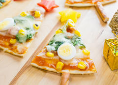 ピザクラスト(18cm)ー1枚 ウインナーー4本 ほうれん草ー1束 玉ねぎー1/4個 水煮コーンー80g うずらの卵ー2個 ピザソースー大さじ3 とろけるチーズー大さじ3 飾り用パプリカー2枚 棒状のお菓子(プリッツ等)ー4〜5本